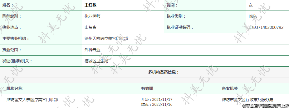 主要执业机构:德州天宏医疗美容门诊部