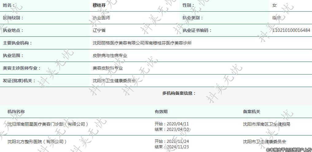 主要执业机构:沈阳丽格医疗美容有限公司浑南穆桂芬医疗美容诊所
