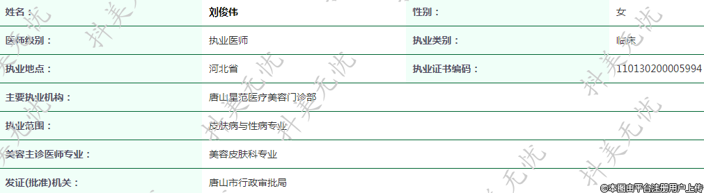 主要执业机构:唐山星范医疗美容门诊部