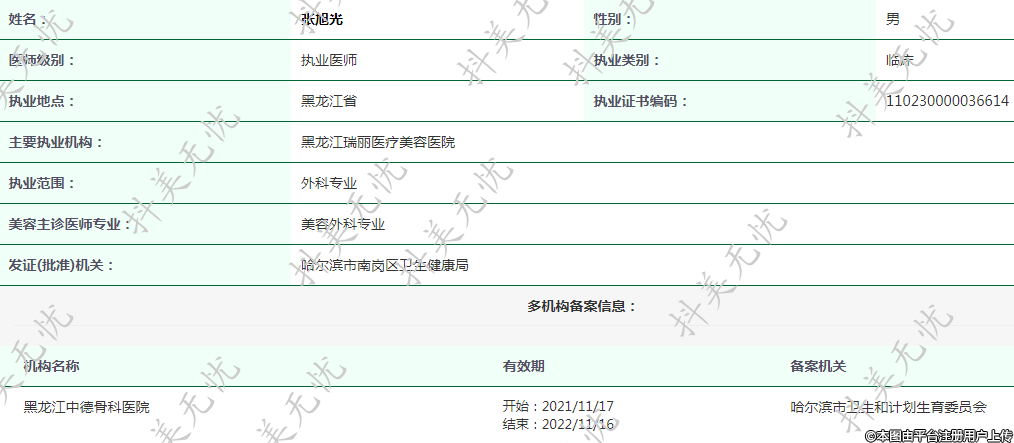 主要执业机构:黑龙江瑞丽医疗美容医院