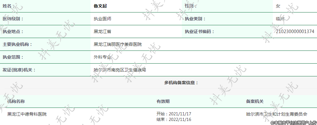 主要执业机构:黑龙江瑞丽医疗美容医院