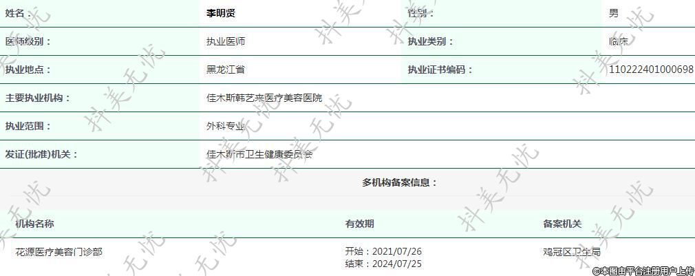 现任佳木斯韩艺来医疗美容医院执业医师