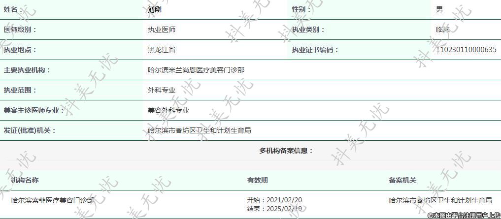 主要执业机构:哈尔滨米兰尚恩医疗美容门诊部