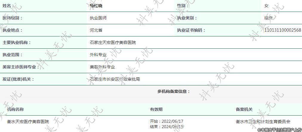 主要执业机构:石家庄天宏医疗美容医院