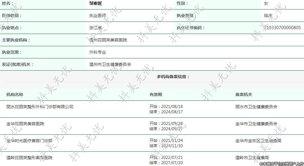 温州芘丽芙医疗美容执业医师