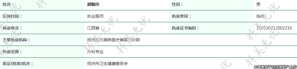 主要执业机构:抚州东方薇琳医疗美容门诊部