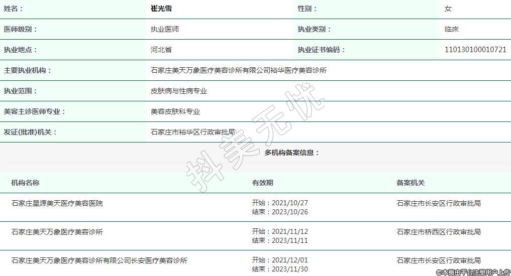 主要执业机构:石家庄美天万象医疗美容诊所有限公司裕华医疗美容诊所