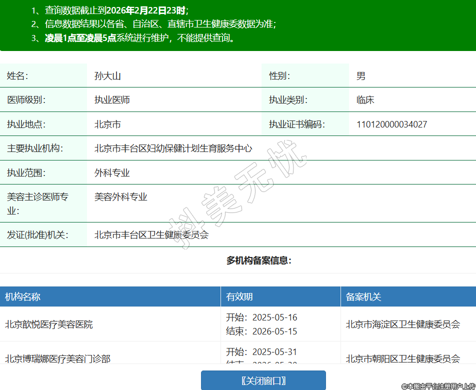 姓名:孙大山性别:男医师级别:执业医师执业类别:临床执业地点:北京市执业证书编码:110120000034027主要执业机构:北京市丰台区妇幼保健计划生育服务中心执业范围:外科专业美容主诊医师专业:美容外科专业发证(批准)机关:北京市丰台区卫生健康委员会多机构备案信息:机构名称 有效期 备案机关 北京歆悦医疗美容医院 开始:2025-05-16结束:2026-05-15北京市海淀区卫生健康委员会 北京博瑞娜医疗美容门诊部 开始:2025-05-31结束:2026-05-30北京市朝阳区卫生健康委员会 岩之畔医巢(北京)医疗美容门诊部 开始:2025-06-19结束:2026-06-18北京市海淀区卫生健康委员会 北京星美汇医疗美容门诊部 开始:2025-06-26结束:2026-06-26北京市朝阳区卫生健康委员会 北京星耀医疗美容门诊部 开始:2025-06-27结束:2026-06-26北京市朝阳区卫生健康委员会 北京米兰柏羽丽都医疗美容医院 开始:2025-08-05结束:2027-08-01北京市朝阳区卫生健康委员会 京玺(北京)医疗美容门诊部 开始:2025-11-12结束:2026-11-11北京市海淀区卫生健康委员会 北京润美玉之光医疗美容门诊部 开始:2026-02-03结束:2027-01-31北京市朝阳区卫生健康委员会 -
