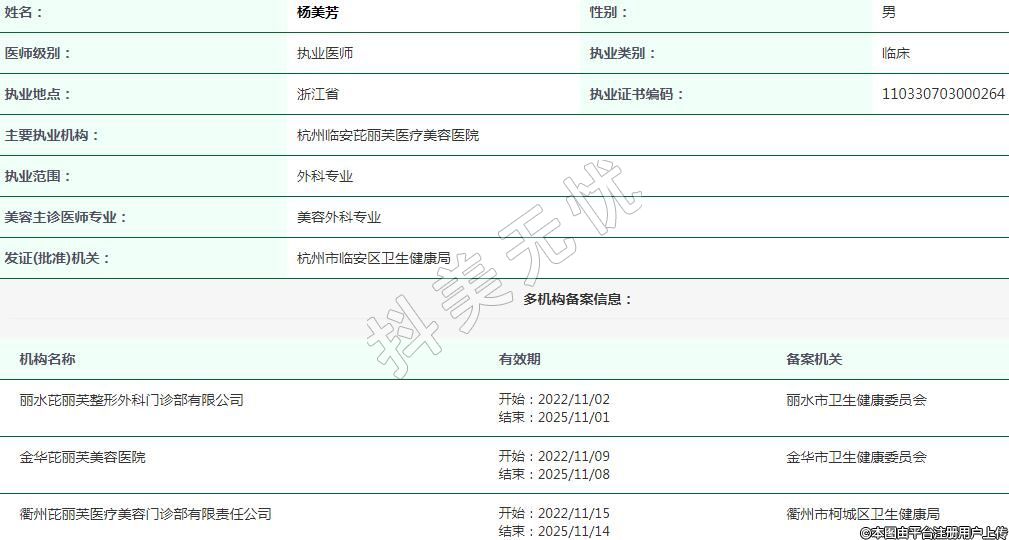 主要执业机构:杭州临安芘丽芙医疗美容医院
