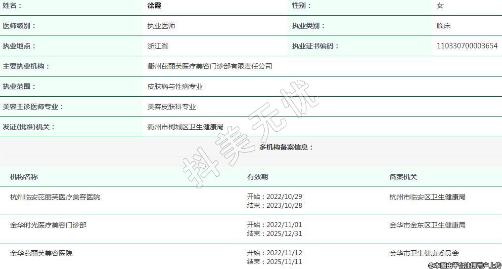 主要执业机构:衢州芘丽芙医疗美容门诊部有限责任公司