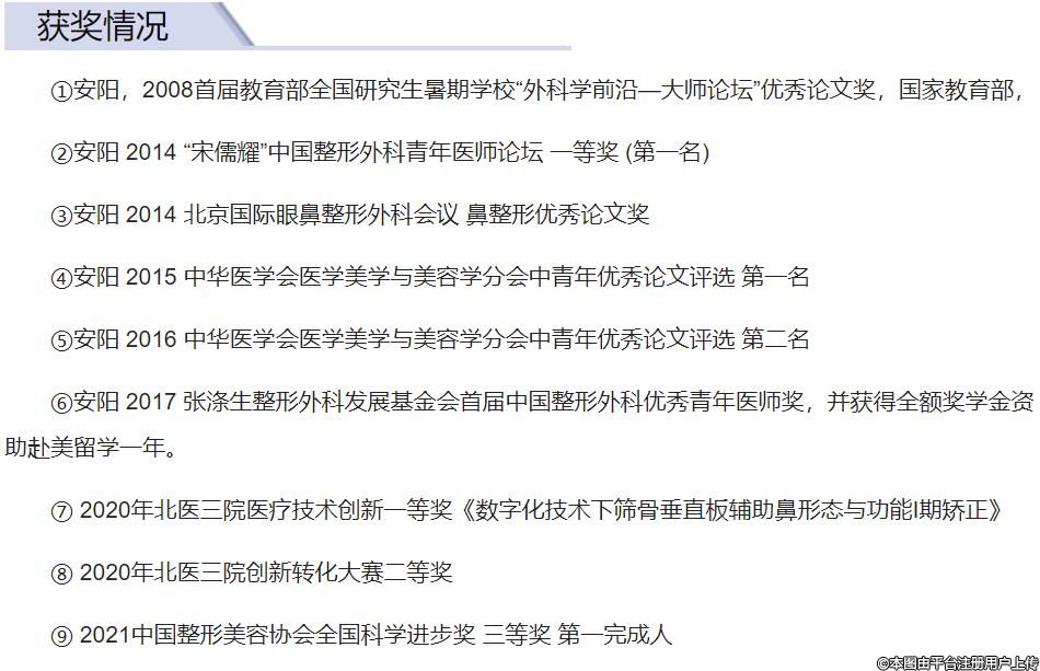 6) Yang An, Dong Li. Morphologic and functional correction for nasal deviation/ A Novel Technique for Short Nose Correction In Asians: Combining M-shaped Conchal Cartilage With Septal Extension Graft/ Short Nose Correction in Asians.第19、20、21届韩国国际鼻整形年会2015.2016.2018,韩国首尔,大会报告并担任分会场主席