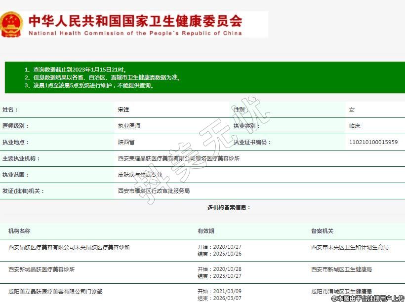 主要执业机构:西安荣耀晶肤医疗美容有限公司雁塔医疗美容诊所