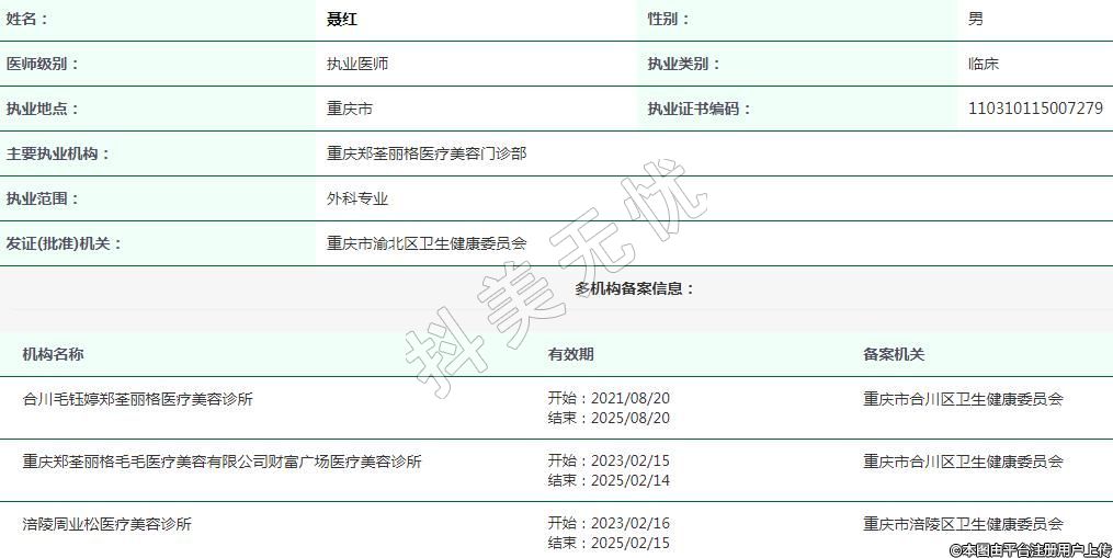 主要执业机构:重庆郑荃丽格医疗美容门诊部