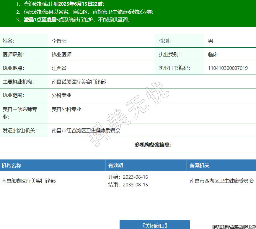 姓名:李晋阳性别:男医师级别:执业医师执业类别:临床执业地点:江西省执业证书编码:110410300007019主要执业机构:南昌诺颜医疗美容门诊部执业范围:外科专业美容主诊医师专业:美容外科专业发证(批准)机关:南昌市红谷滩区卫生健康委员会多机构备案信息:机构名称 有效期 备案机关 南昌颜咖医疗美容门诊部 开始:2023-08-16结束:2033-08-15南昌市西湖区卫生健康委员会 -