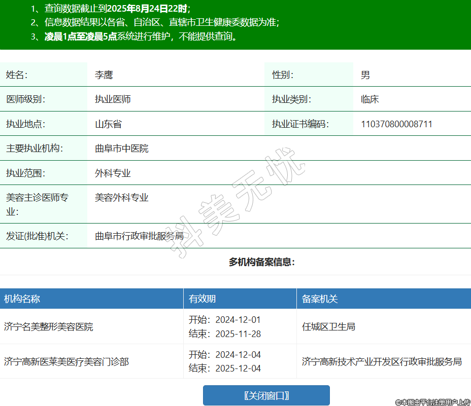 姓名:李鹰性别:男医师级别:执业医师执业类别:临床执业地点:山东省执业证书编码:110370800008711主要执业机构:曲阜市中医院执业范围:外科专业美容主诊医师专业:美容外科专业发证(批准)机关:曲阜市行政审批服务局多机构备案信息:机构名称 有效期 备案机关 济宁名美整形美容医院 开始:2024-12-01结束:2025-11-28任城区卫生局 济宁高新医莱美医疗美容门诊部 开始:2024-12-04结束:2025-12-04济宁高新技术产业开发区行政审批服务局 -