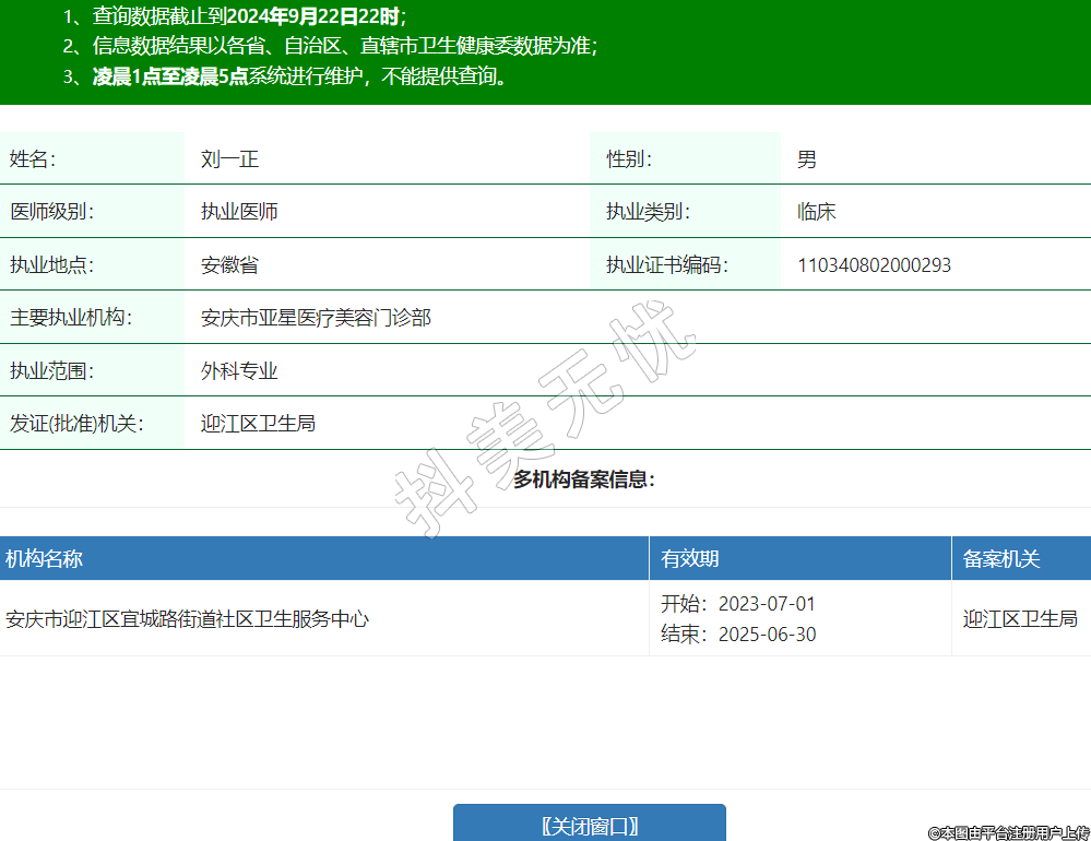 主要执业机构:安庆市亚星医疗美容门诊部