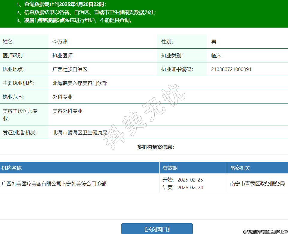 北海市银海区卫生健康局多机构备案信息:机构名称 有效期 备案机关 广西韩美医疗美容有限公司南宁韩美综合门诊部 开始:2025-02-25结束:2026-02-24南宁市青秀区政务服务局 -