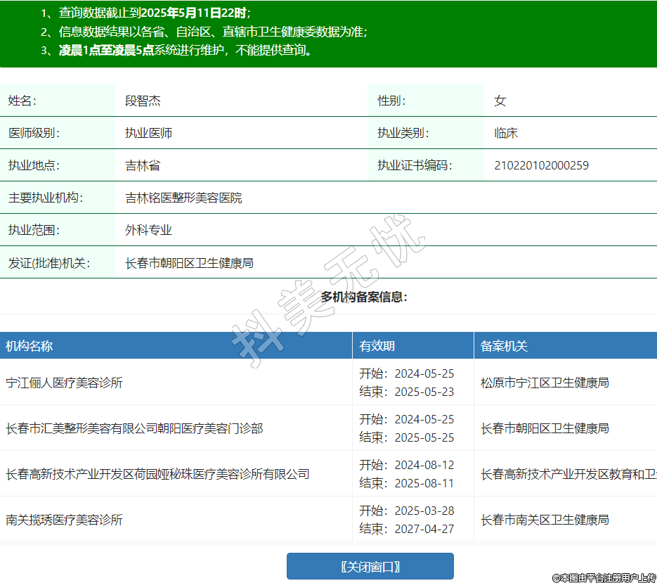 姓名:段智杰性别:女医师级别:执业医师执业类别:临床执业地点:吉林省执业证书编码:210220102000259主要执业机构:吉林铭医整形美容医院执业范围:外科专业发证(批准)机关:长春市朝阳区卫生健康局多机构备案信息:机构名称 有效期 备案机关 宁江俪人医疗美容诊所 开始:2024-05-25结束:2025-05-23松原市宁江区卫生健康局 长春市汇美整形美容有限公司朝阳医疗美容门诊部 开始:2024-05-25结束:2025-05-25长春市朝阳区卫生健康局 长春高新技术产业开发区荷园娅秘珠医疗美容诊所有限公司 开始:2024-08-12结束:2025-08-11长春高新技术产业开发区教育和卫生健康局 南关揽琇医疗美容诊所 开始:2025-03-28结束:2027-04-27长春市南关区卫生健康局 -