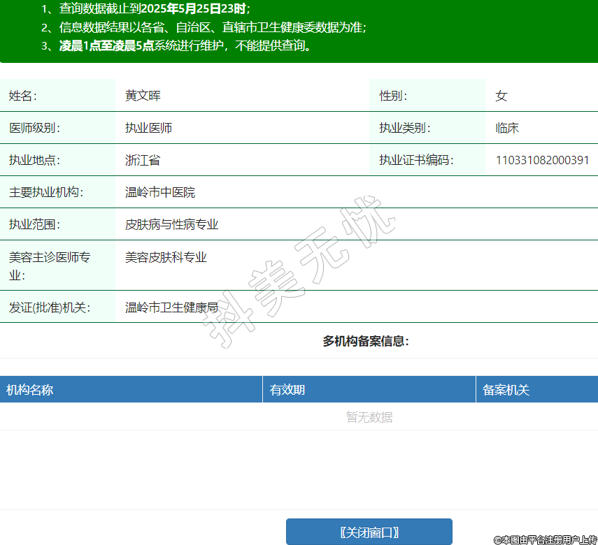 姓名:黄文晖性别:女医师级别:执业医师执业类别:临床执业地点:浙江省执业证书编码:110331082000391主要执业机构:温岭市中医院执业范围:皮肤病与性病专业美容主诊医师专业:美容皮肤科专业发证(批准)机关:温岭市卫生健康局 -