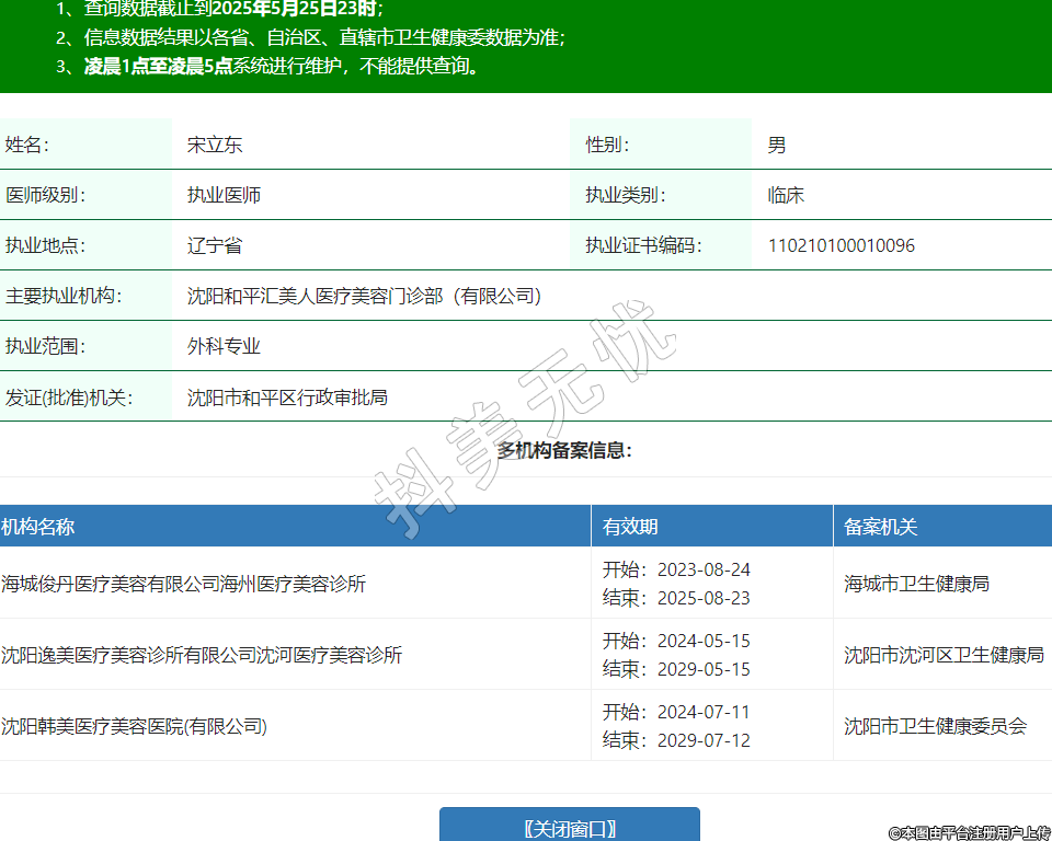 姓名:宋立东性别:男医师级别:执业医师执业类别:临床执业地点:辽宁省执业证书编码:110210100010096主要执业机构:沈阳和平汇美人医疗美容门诊部(有限公司)执业范围:外科专业发证(批准)机关:沈阳市和平区行政审批局多机构备案信息:机构名称 有效期 备案机关 海城俊丹医疗美容有限公司海州医疗美容诊所 开始:2023-08-24结束:2025-08-23海城市卫生健康局 沈阳逸美医疗美容诊所有限公司沈河医疗美容诊所 开始:2024-05-15结束:2029-05-15沈阳市沈河区卫生健康局 沈阳韩美医疗美容医院(有限公司) 开始:2024-07-11结束:2029-07-12沈阳市卫生健康委员会 -