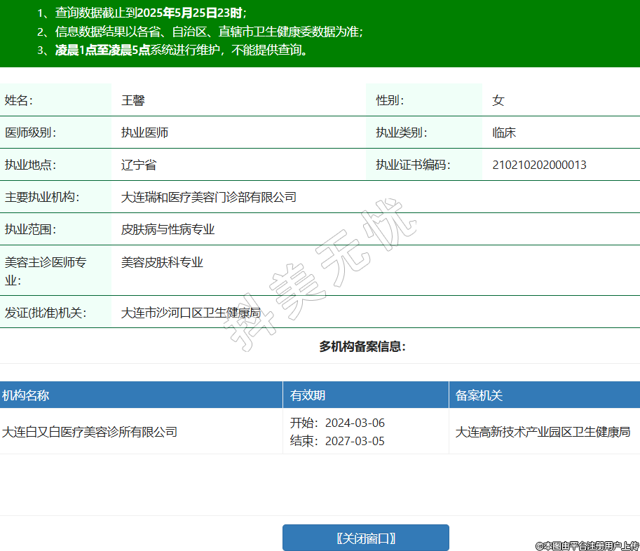 姓名:王馨性别:女医师级别:执业医师执业类别:临床执业地点:辽宁省执业证书编码:210210202000013主要执业机构:大连瑞和医疗美容门诊部有限公司执业范围:皮肤病与性病专业美容主诊医师专业:美容皮肤科专业发证(批准)机关:大连市沙河口区卫生健康局多机构备案信息:机构名称 有效期 备案机关 大连白又白医疗美容诊所有限公司 开始:2024-03-06结束:2027-03-05大连高新技术产业园区卫生健康局 -