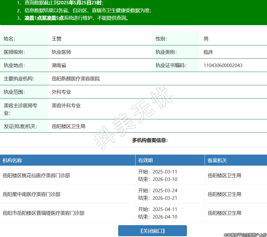 姓名:王赞性别:男医师级别:执业医师执业类别:临床执业地点:湖南省执业证书编码:110430600002043主要执业机构:岳阳新颜医疗美容医院执业范围:外科专业美容主诊医师专业:美容外科专业发证(批准)机关:岳阳楼区卫生局多机构备案信息:机构名称 有效期 备案机关 岳阳楼区桃花仙医疗美容门诊部 开始:2025-03-11结束:2026-03-10岳阳楼区卫生局 岳阳星中南医疗美容门诊部 开始:2025-03-24结束:2026-03-21岳阳楼区卫生局 岳阳市岳阳楼区普瑞缇医疗美容门诊部 开始:2025-04-11结束:2026-04-10岳阳楼区卫生局 岳阳市南湖新区榆梵皙医疗美容门诊部 开始:2025-04-18结束:2026-04-17岳阳市南湖新区卫生健康局 -