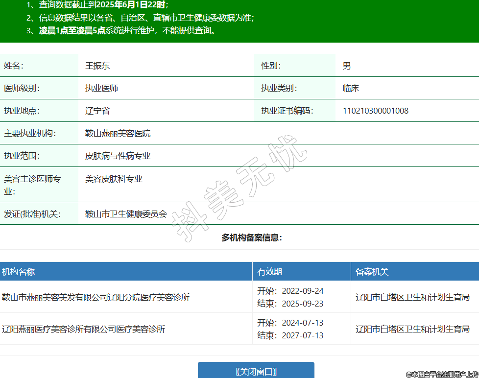 姓名:王振东性别:男医师级别:执业医师执业类别:临床执业地点:辽宁省执业证书编码:110210300001008主要执业机构:鞍山燕丽美容医院执业范围:皮肤病与性病专业美容主诊医师专业:美容皮肤科专业发证(批准)机关:鞍山市卫生健康委员会多机构备案信息:机构名称 有效期 备案机关 鞍山市燕丽美容美发有限公司辽阳分院医疗美容诊所 开始:2022-09-24结束:2025-09-23辽阳市白塔区卫生和计划生育局 辽阳燕丽医疗美容诊所有限公司医疗美容诊所 开始:2024-07-13结束:2027-07-13辽阳市白塔区卫生和计划生育局 -