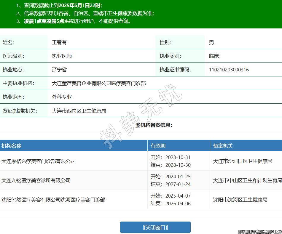 姓名:王春有性别:男医师级别:执业医师执业类别:临床执业地点:辽宁省执业证书编码:110210203000316主要执业机构:大连董萍美容企业有限公司医疗美容门诊部执业范围:外科专业发证(批准)机关:大连市西岗区卫生健康局多机构备案信息:机构名称 有效期 备案机关 大连摩格医疗美容门诊部有限公司 开始:2023-10-31结束:2028-10-30大连市沙河口区卫生健康局 大连九铭医疗美容诊所有限公司 开始:2024-01-25结束:2027-01-24大连市中山区卫生和计划生育局 沈阳玺然医疗美容有限公司沈河医疗美容门诊部 开始:2025-04-07结束:2026-04-06沈阳市沈河区卫生健康局 -