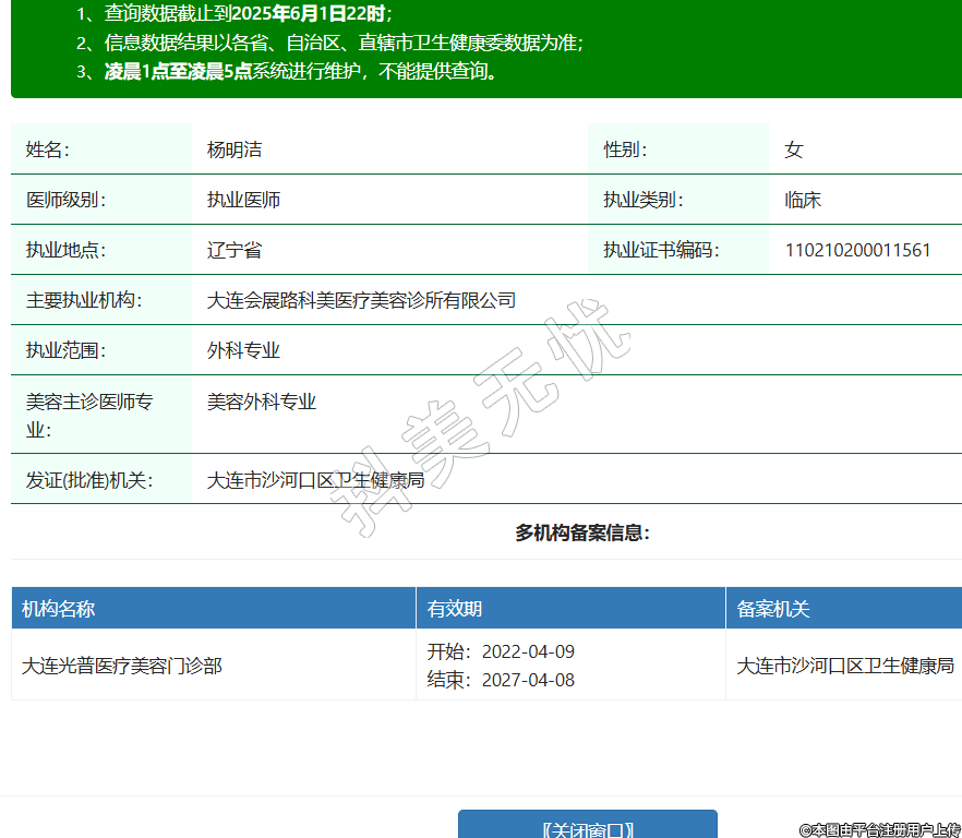 姓名:杨明洁性别:女医师级别:执业医师执业类别:临床执业地点:辽宁省执业证书编码:110210200011561主要执业机构:大连会展路科美医疗美容诊所有限公司执业范围:外科专业美容主诊医师专业:美容外科专业发证(批准)机关:大连市沙河口区卫生健康局多机构备案信息:机构名称 有效期 备案机关 大连光普医疗美容门诊部 开始:2022-04-09结束:2027-04-08大连市沙河口区卫生健康局 -