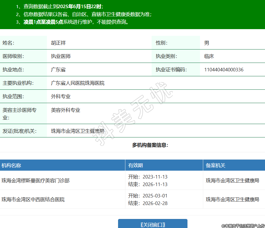 姓名:胡正祥性别:男医师级别:执业医师执业类别:临床执业地点:广东省执业证书编码:110440404000336主要执业机构:广东省人民医院珠海医院执业范围:外科专业美容主诊医师专业:美容外科专业发证(批准)机关:珠海市金湾区卫生健康局多机构备案信息:机构名称 有效期 备案机关 珠海金湾缪斯曼医疗美容门诊部 开始:2023-11-13结束:2026-11-13珠海市金湾区卫生健康局 珠海市金湾区中西医结合医院 开始:2025-03-01结束:2026-02-28珠海市金湾区卫生健康局 -