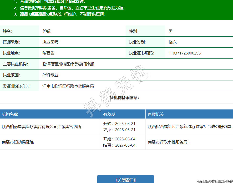 姓名:郭锐性别:男医师级别:执业医师执业类别:临床执业地点:陕西省执业证书编码:110371726000296主要执业机构:临渭蓓蕾斯特医疗美容门诊部执业范围:外科专业发证(批准)机关:渭南市临渭区行政审批服务局多机构备案信息:机构名称 有效期 备案机关 陕西柏丽星美医疗美容有限公司沣东美容诊所 开始:2025-03-21结束:2026-03-21陕西省西咸新区沣东新城行政审批与政务服务局 商洛市妇幼保健院 开始:2025-06-04结束:2027-06-04商洛市行政审批服务局 -