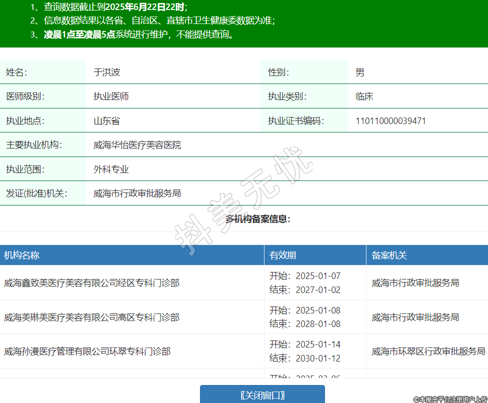 姓名:于洪波性别:男医师级别:执业医师执业类别:临床执业地点:山东省执业证书编码:110110000039471主要执业机构:威海华怡医疗美容医院执业范围:外科专业发证(批准)机关:威海市行政审批服务局多机构备案信息:机构名称 有效期 备案机关 威海鑫致美医疗美容有限公司经区专科门诊部 开始:2025-01-07结束:2027-01-02威海市行政审批服务局 威海美琳美医疗美容有限公司高区专科门诊部 开始:2025-01-08结束:2028-01-08威海市行政审批服务局 威海孙漫医疗管理有限公司环翠专科门诊部 开始:2025-01-14结束:2030-01-12威海市环翠区行政审批服务局 环翠兰积专科门诊部 开始:2025-03-06结束:2030-02-13威海市环翠区行政审批服务局 威海华怡口腔门诊部有限公司环翠口腔门诊部 开始:2025-03-10结束:2030-03-10威海市环翠区行政审批服务局 艺添致美(威海)医疗美容有限公司经区专科门诊部 开始:2025-04-22结束:2035-04-23威海市行政审批服务局 -