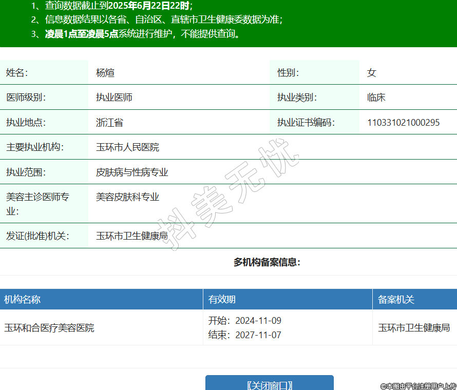 姓名:杨煊性别:女医师级别:执业医师执业类别:临床执业地点:浙江省执业证书编码:110331021000295主要执业机构:玉环市人民医院执业范围:皮肤病与性病专业美容主诊医师专业:美容皮肤科专业发证(批准)机关:玉环市卫生健康局多机构备案信息:机构名称 有效期 备案机关 玉环和合医疗美容医院 开始:2024-11-09结束:2027-11-07玉环市卫生健康局 -