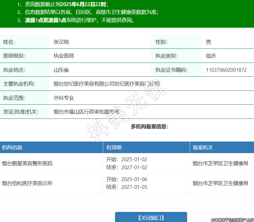 姓名:张汉刚性别:男医师级别:执业医师执业类别:临床执业地点:山东省执业证书编码:110370602001872主要执业机构:烟台世纪医疗美容有限公司世纪医疗美容门诊部执业范围:外科专业发证(批准)机关:烟台市福山区行政审批服务局多机构备案信息:机构名称 有效期 备案机关 烟台鹏爱美容整形医院 开始:2025-01-02结束:2027-01-02烟台市芝罘区卫生健康局 烟台佰和医疗美容诊所 开始:2025-01-06结束:2027-01-05烟台市芝罘区卫生健康局 -