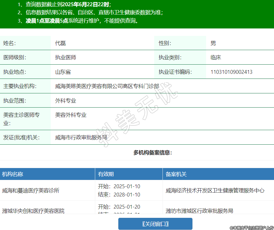 姓名:代磊性别:男医师级别:执业医师执业类别:临床执业地点:山东省执业证书编码:110310109002413主要执业机构:威海美琳美医疗美容有限公司高区专科门诊部执业范围:外科专业美容主诊医师专业:美容外科专业发证(批准)机关:威海市行政审批服务局多机构备案信息:机构名称 有效期 备案机关 威海和蔓迪医疗美容诊所 开始:2025-01-10结束:2028-01-10威海经济技术开发区卫生健康管理服务中心 潍城华央创和医疗美容医院 开始:2025-01-20结束:2026-01-01潍坊市潍城区行政审批服务局 威海仙美医疗美容诊所 开始:2025-03-15结束:2028-03-15威海火炬高技术产业开发区社会事业务局 -