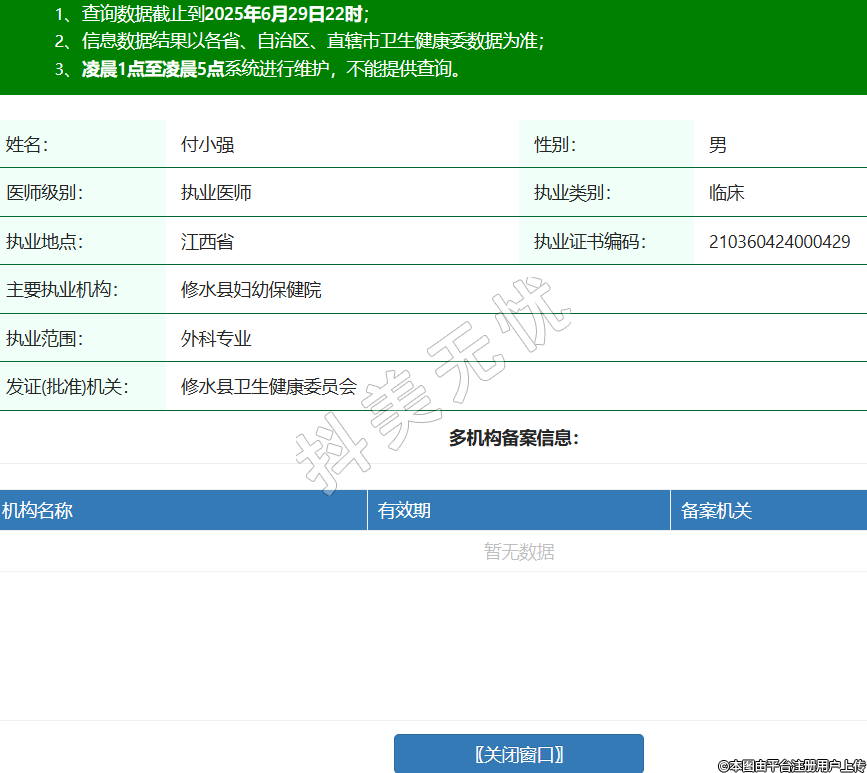 姓名:付小强性别:男医师级别:执业医师执业类别:临床执业地点:江西省执业证书编码:210360424000429主要执业机构:修水县妇幼保健院执业范围:外科专业发证(批准)机关:修水县卫生健康委员会 -