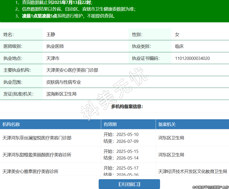 姓名:王静性别:女医师级别:执业医师执业类别:临床执业地点:天津市执业证书编码:110120000034020主要执业机构:天津美安心医疗美容门诊部执业范围:皮肤病与性病专业发证(批准)机关:滨海新区卫生局多机构备案信息:机构名称 有效期 备案机关 天津河东菲丝澜玺悦医疗美容门诊部 开始:2025-05-10结束:2026-07-09河东区卫生局 天津河东甜橙盈美丽颜医疗美容诊所 开始:2025-05-15结束:2026-05-14河东区卫生局 天津美安心雅泰医疗美容诊所 开始:2025-05-17结束:2026-05-16天津经济技术开发区文化教育卫生局 天津河东伊颂玺悦医疗美容门诊部 开始:2025-06-17结束:2026-06-16河东区卫生局 -