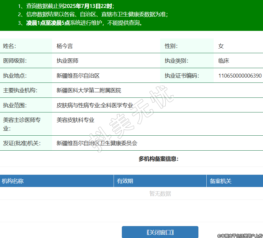姓名:杨今言性别:女医师级别:执业医师执业类别:临床执业地点:新疆维吾尔自治区执业证书编码:110650000006390主要执业机构:新疆医科大学第二附属医院执业范围:皮肤病与性病专业;全科医学专业美容主诊医师专业:美容皮肤科专业发证(批准)机关:新疆维吾尔自治区卫生健康委员会 -