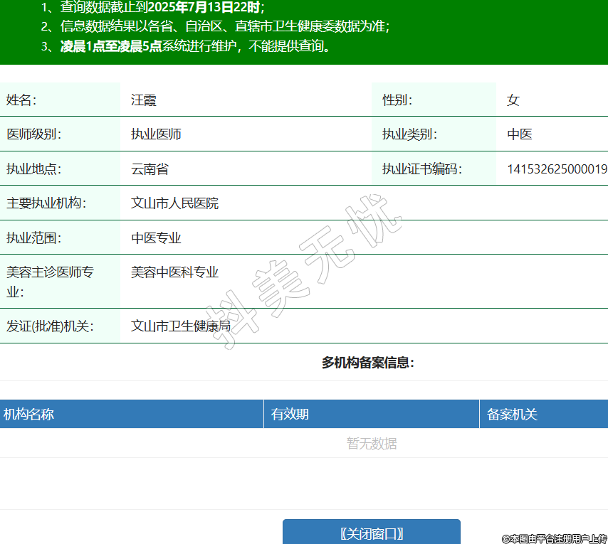 姓名:汪霞性别:女医师级别:执业医师执业类别:中医执业地点:云南省执业证书编码:141532625000019主要执业机构:文山市人民医院执业范围:中医专业美容主诊医师专业:美容中医科专业发证(批准)机关:文山市卫生健康局 -