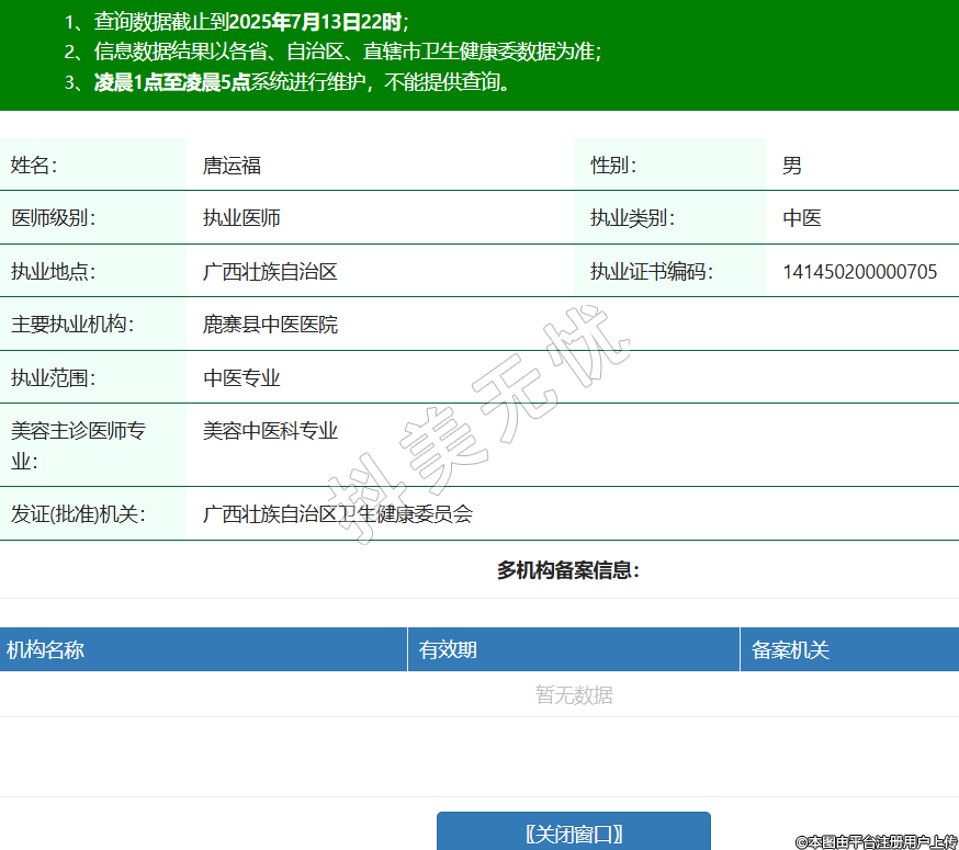 姓名:唐运福性别:男医师级别:执业医师执业类别:中医执业地点:广西壮族自治区执业证书编码:141450200000705主要执业机构:鹿寨县中医医院执业范围:中医专业美容主诊医师专业:美容中医科专业发证(批准)机关:广西壮族自治区卫生健康委员会 -