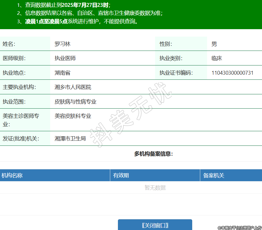 姓名:罗习林性别:男医师级别:执业医师执业类别:临床执业地点:湖南省执业证书编码:110430300000731主要执业机构:湘乡市人民医院执业范围:皮肤病与性病专业美容主诊医师专业:美容皮肤科专业发证(批准)机关:湘潭市卫生局 -