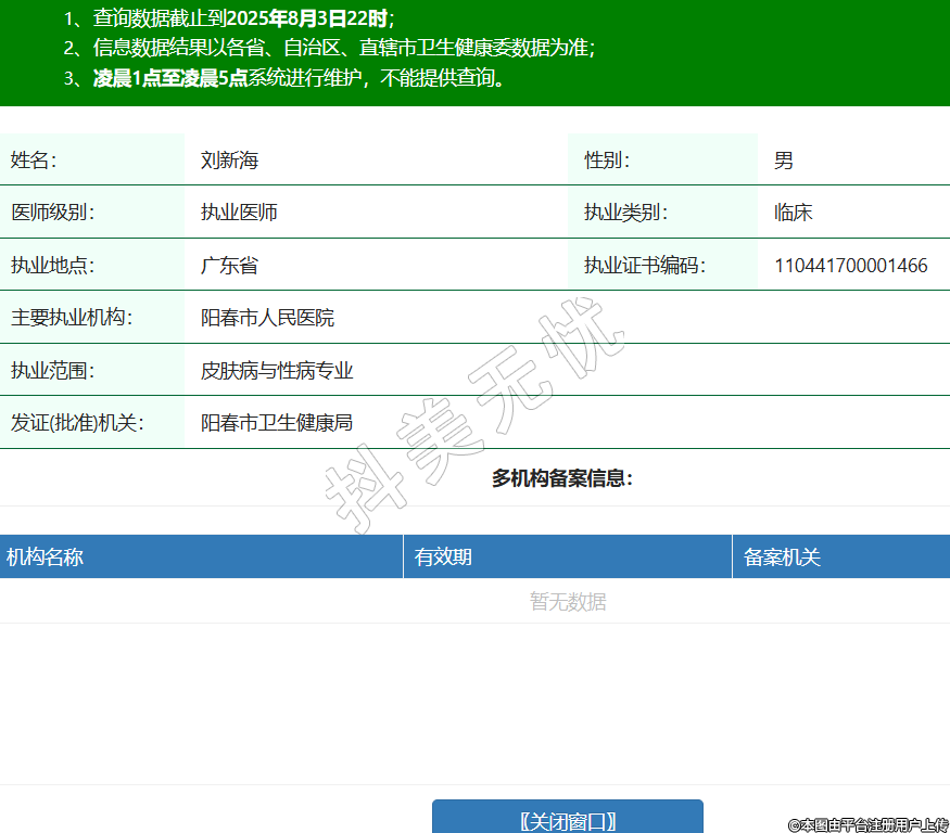 姓名:刘新海性别:男医师级别:执业医师执业类别:临床执业地点:广东省执业证书编码:110441700001466主要执业机构:阳春市人民医院执业范围:皮肤病与性病专业发证(批准)机关:阳春市卫生健康局 -