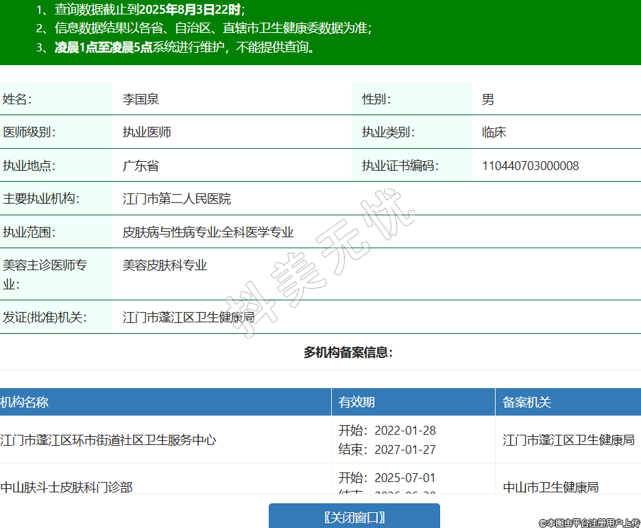 姓名:李国泉性别:男医师级别:执业医师执业类别:临床执业地点:广东省执业证书编码:110440703000008主要执业机构:江门市第二人民医院执业范围:皮肤病与性病专业;全科医学专业美容主诊医师专业:美容皮肤科专业发证(批准)机关:江门市蓬江区卫生健康局多机构备案信息:机构名称 有效期 备案机关 江门市蓬江区环市街道社区卫生服务中心 开始:2022-01-28结束:2027-01-27江门市蓬江区卫生健康局 中山肤斗士皮肤科门诊部 开始:2025-07-01结束:2026-06-30中山市卫生健康局 -