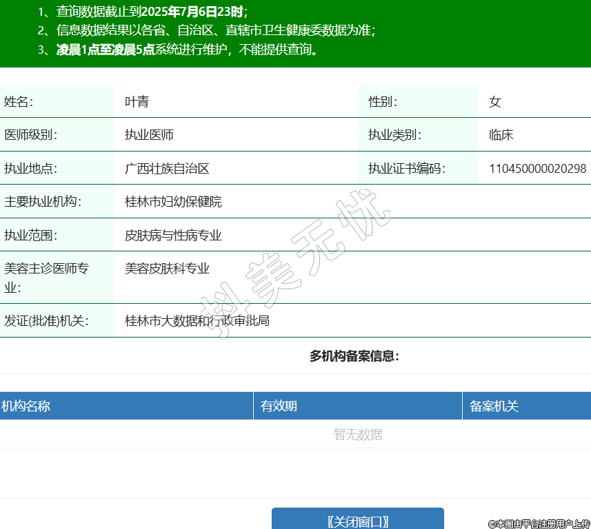 姓名:叶青性别:女医师级别:执业医师执业类别:临床执业地点:广西壮族自治区执业证书编码:110450000020298主要执业机构:桂林市妇幼保健院执业范围:皮肤病与性病专业美容主诊医师专业:美容皮肤科专业发证(批准)机关:桂林市大数据和行政审批局 -
