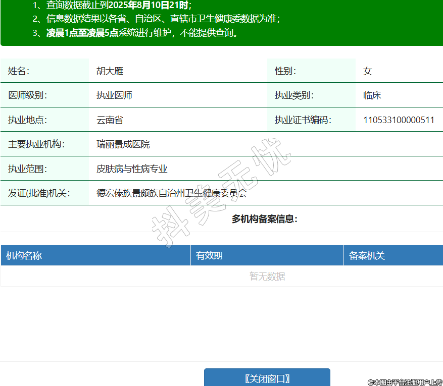 姓名:胡大雁性别:女医师级别:执业医师执业类别:临床执业地点:云南省执业证书编码:110533100000511主要执业机构:瑞丽景成医院执业范围:皮肤病与性病专业发证(批准)机关:德宏傣族景颇族自治州卫生健康委员会 -