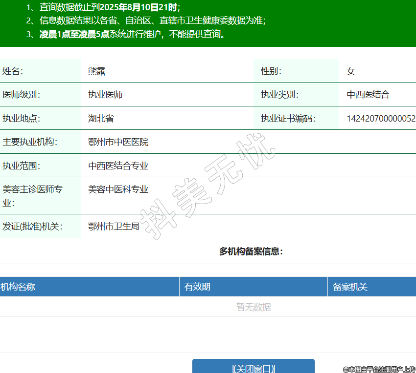 姓名:熊露性别:女医师级别:执业医师执业类别:中西医结合执业地点:湖北省执业证书编码:142420700000052主要执业机构:鄂州市中医医院执业范围:中西医结合专业美容主诊医师专业:美容中医科专业发证(批准)机关:鄂州市卫生局 -