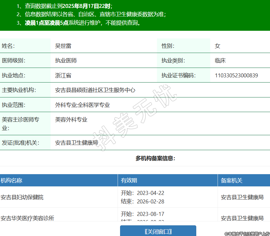 姓名:吴世雷性别:女医师级别:执业医师执业类别:临床执业地点:浙江省执业证书编码:110330523000839主要执业机构:安吉县昌硕街道社区卫生服务中心执业范围:外科专业;全科医学专业美容主诊医师专业:美容外科专业发证(批准)机关:安吉县卫生健康局多机构备案信息:机构名称 有效期 备案机关 安吉县妇幼保健院 开始:2023-04-22结束:2026-02-28安吉县卫生健康局 安吉华芙医疗美容诊所 开始:2023-08-17结束:2026-08-03安吉县卫生健康局 安吉新颜医疗美容诊所 开始:2024-11-28结束:2027-11-27安吉县卫生健康局 -
