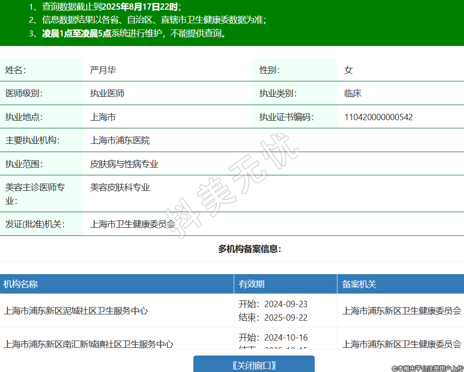 姓名:严月华性别:女医师级别:执业医师执业类别:临床执业地点:上海市执业证书编码:110420000000542主要执业机构:上海市浦东医院执业范围:皮肤病与性病专业美容主诊医师专业:美容皮肤科专业发证(批准)机关:上海市卫生健康委员会多机构备案信息:机构名称 有效期 备案机关 上海市浦东新区泥城社区卫生服务中心 开始:2024-09-23结束:2025-09-22上海市浦东新区卫生健康委员会 上海市浦东新区南汇新城镇社区卫生服务中心 开始:2024-10-16结束:2025-10-15上海市浦东新区卫生健康委员会 -