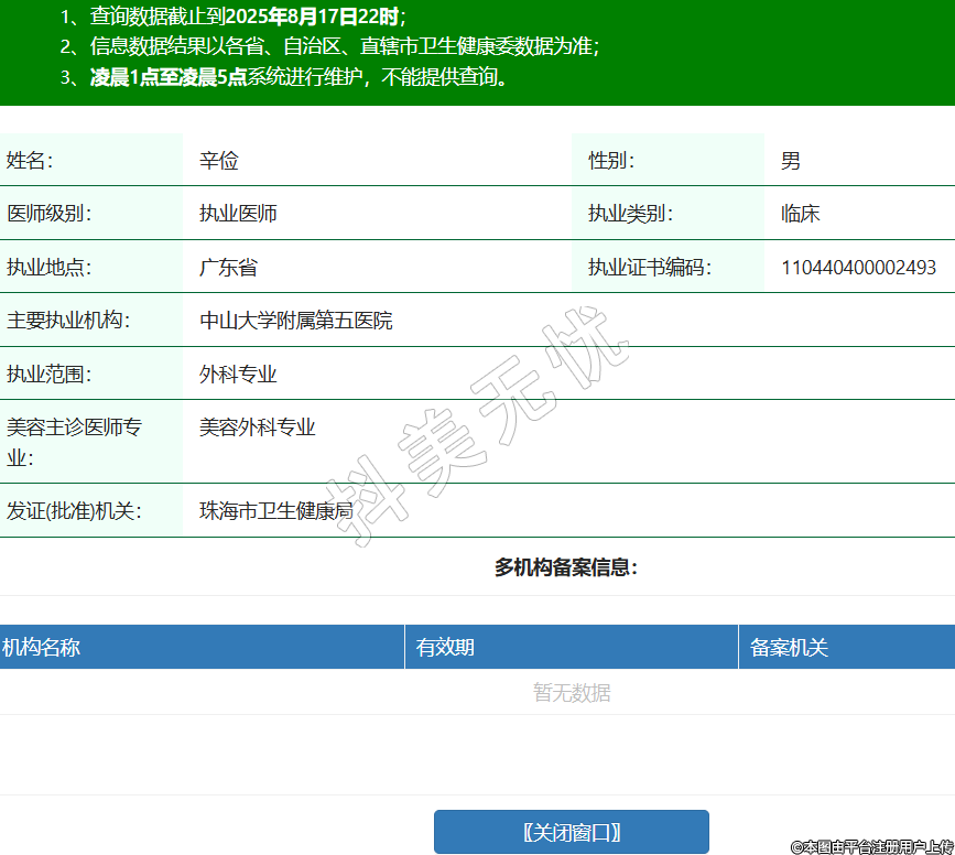 姓名:辛俭性别:男医师级别:执业医师执业类别:临床执业地点:广东省执业证书编码:110440400002493主要执业机构:中山大学附属第五医院执业范围:外科专业美容主诊医师专业:美容外科专业发证(批准)机关:珠海市卫生健康局 -
