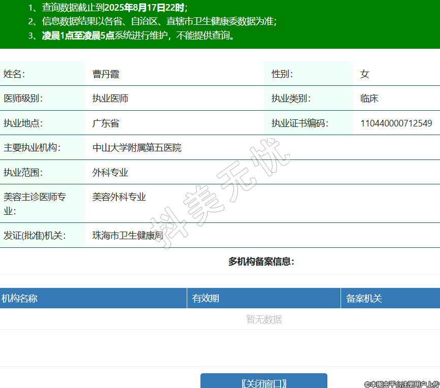 姓名:曹丹霞性别:女医师级别:执业医师执业类别:临床执业地点:广东省执业证书编码:110440000712549主要执业机构:中山大学附属第五医院执业范围:外科专业美容主诊医师专业:美容外科专业发证(批准)机关:珠海市卫生健康局 -